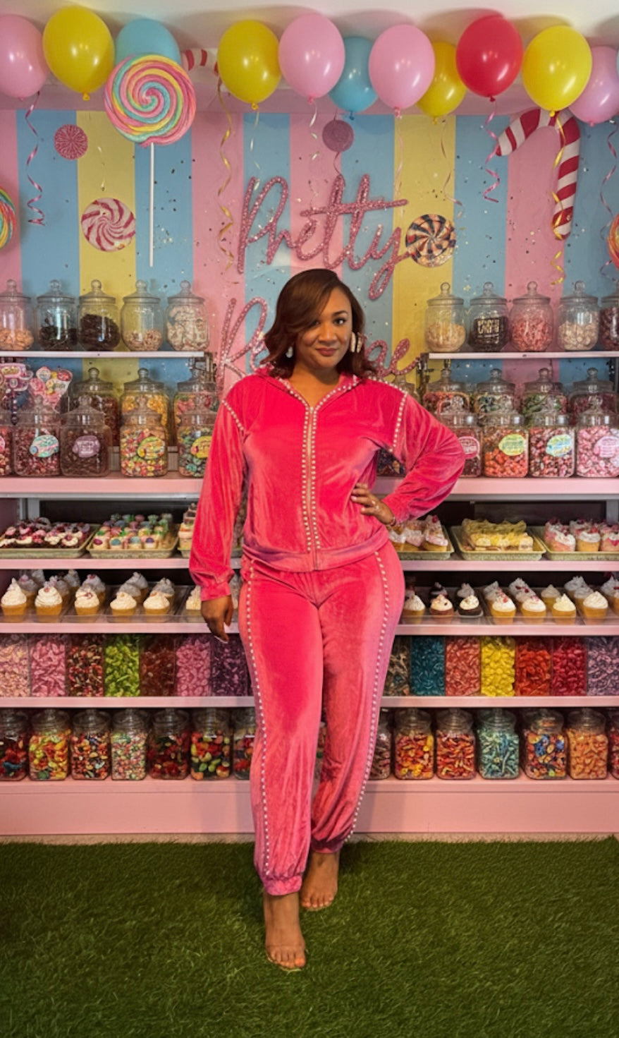 Material is stretchy. Jogger set with pearl embellishments. 90% polyester 10% spandex Model is wearing a size large.