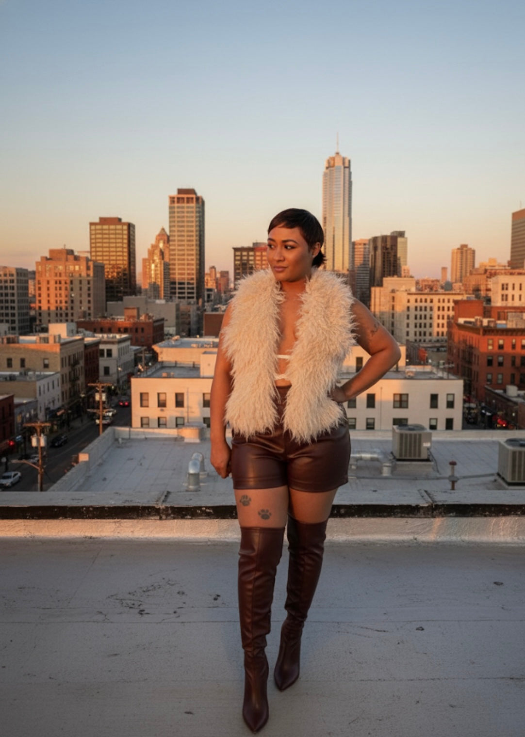 Faux fur halter top/ vest is one size fits most. Top ties up in the back. Can be worn with or without a shirt .