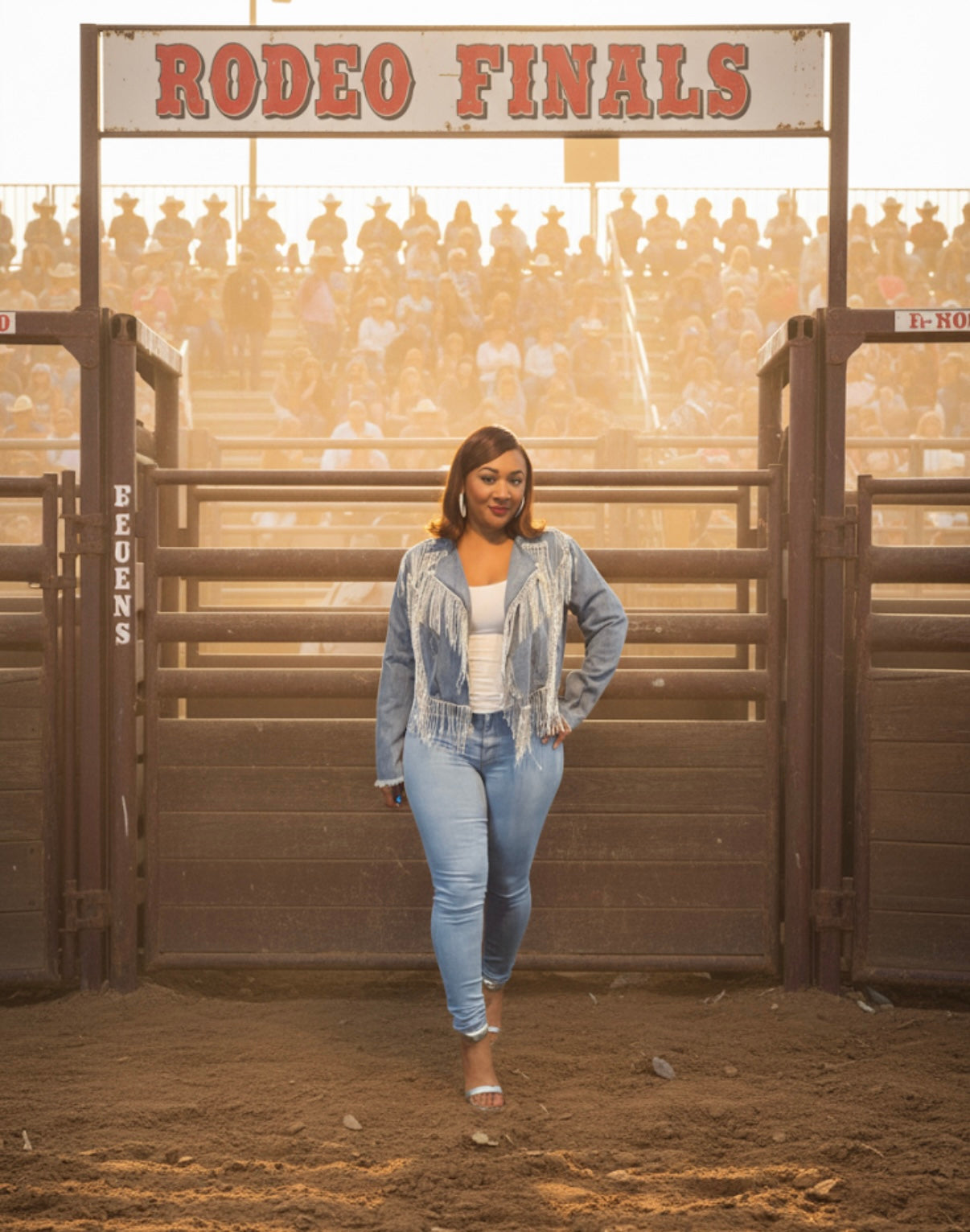 Denim jacket with rhinestone fringe. Model is wearing a size large.