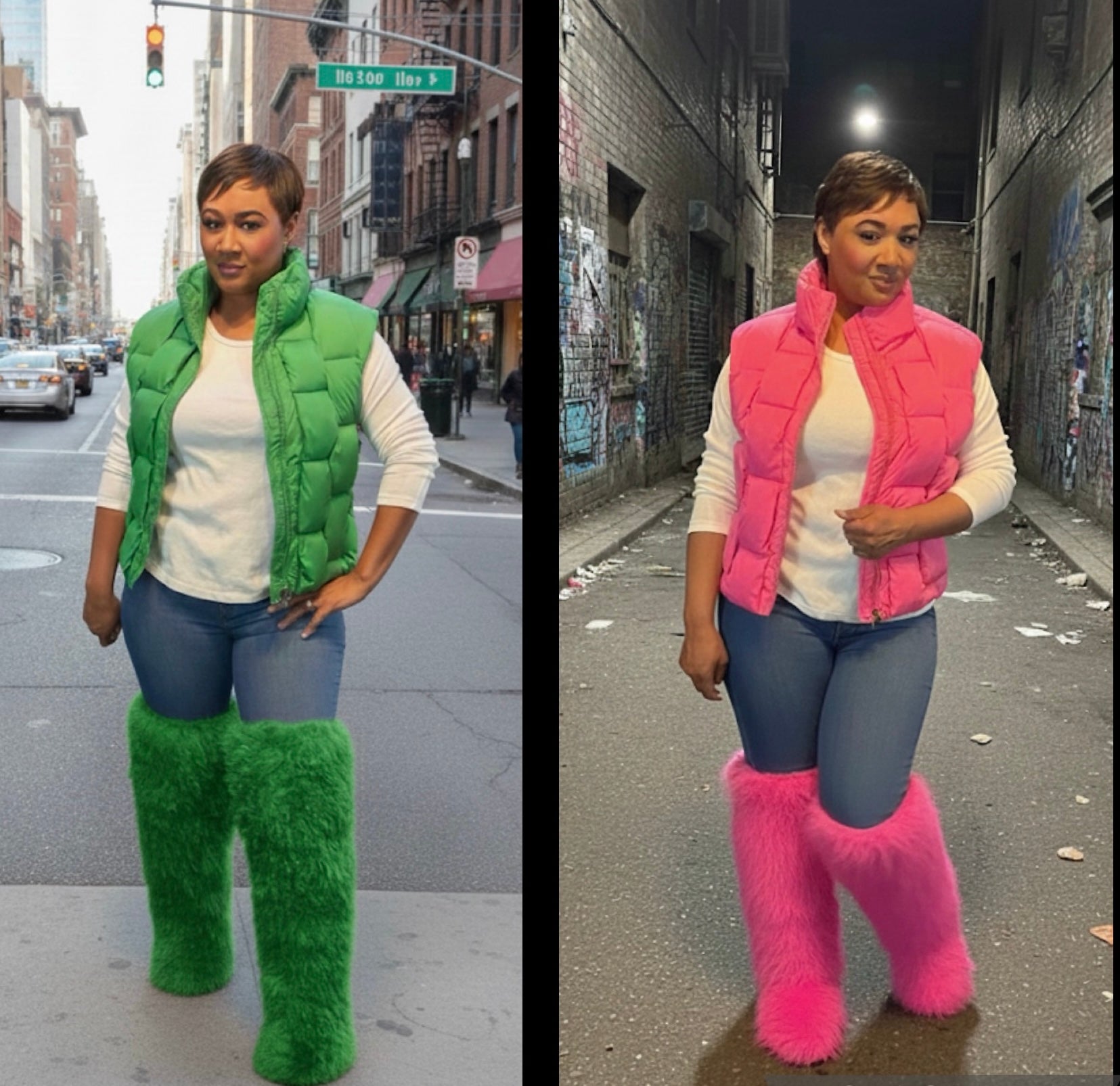 Loose fit. Model is wearing a size medium. Available in green and pink.